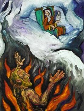 »Bil je bogatin, ki se je oblačil v škrlat in tančico ter se dan na dan sijajno gostil. In bil je neki revež, po imenu Lazar, ki je ležal pri njegovih vratih, poln čirov, in se je želel nasititi s tem, kar je padalo z bogatinove mize. Pa tudi psi so prihajali in mu lizali čire. Umrl pa je revež in angeli so ga nesli v Abrahamovo naročje. Umrl je tudi bogatin in je bil pokopan. … Abraham pa je rekel: ›Sin, spomni se, da si prejel dobro v svojem življenju in prav tako Lazar hudo; zdaj se tukaj veseli, ti pa trpiš.«